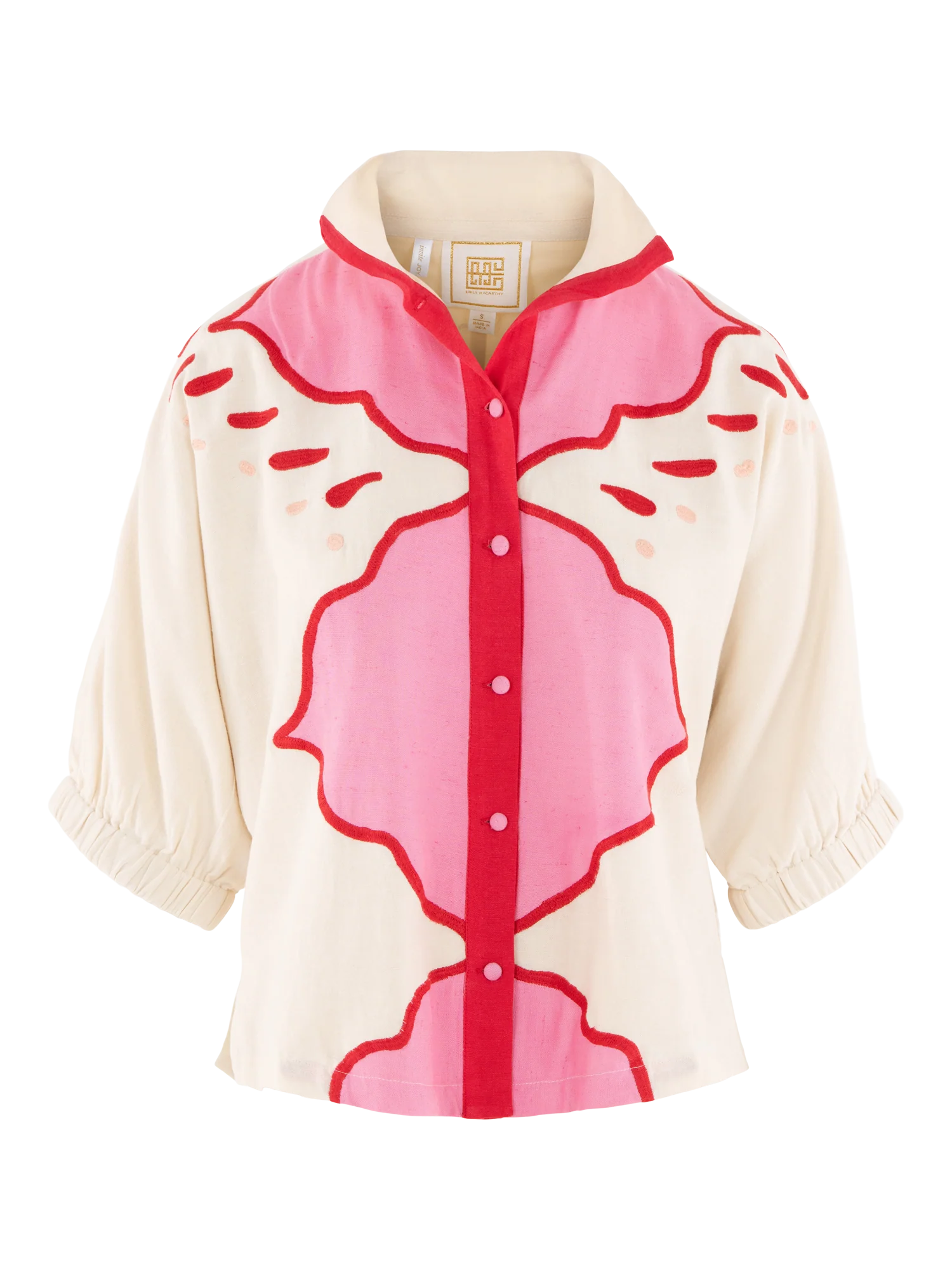 The Bonny Top in Pink Palace from Emily McCarthy draws inspiration from the ornate geometric designs and romantic hues of Jaipur’s storied architecture. Intricate embroidery adds dimension and artistry, creating a striking interplay of pattern and texture. Designed with a classic stand collar, covered front button closure, and relaxed dolman sleeves with soft elastic cuffs, the silhouette drapes with effortless ease. Finished with a loose, flowing shape, this piece feels both artful and refined—an elevated statement rooted in thoughtful design and global influence.