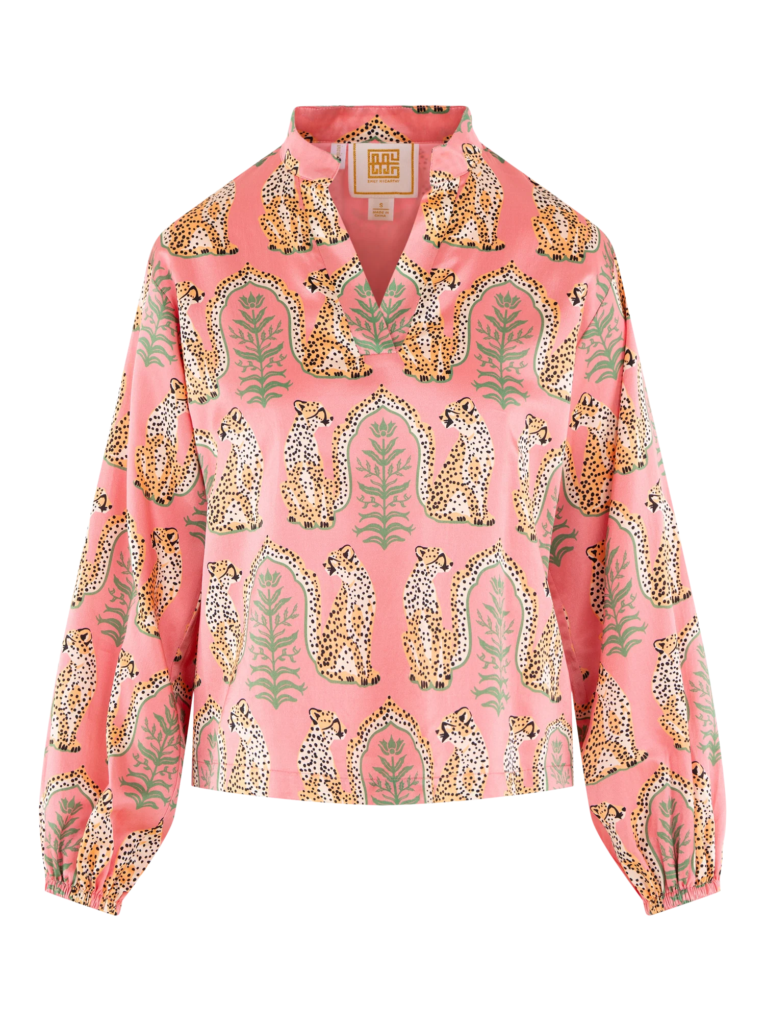 The Lolli Top in Cabana Cat from Emily McCarthy is a statement piece designed with a mandarin-style collar, softly gathered blouson sleeves with elastic cuffs, and an easy silhouette. The playful Cabana Cat motif pairs spotted cheetahs with delicate greenery, creating a whimsical yet artful print that feels both fresh and intentional. Effortless in shape but rich in personality, this style transitions seamlessly from daytime luncheons to spring soirées, offering a distinctive charm.