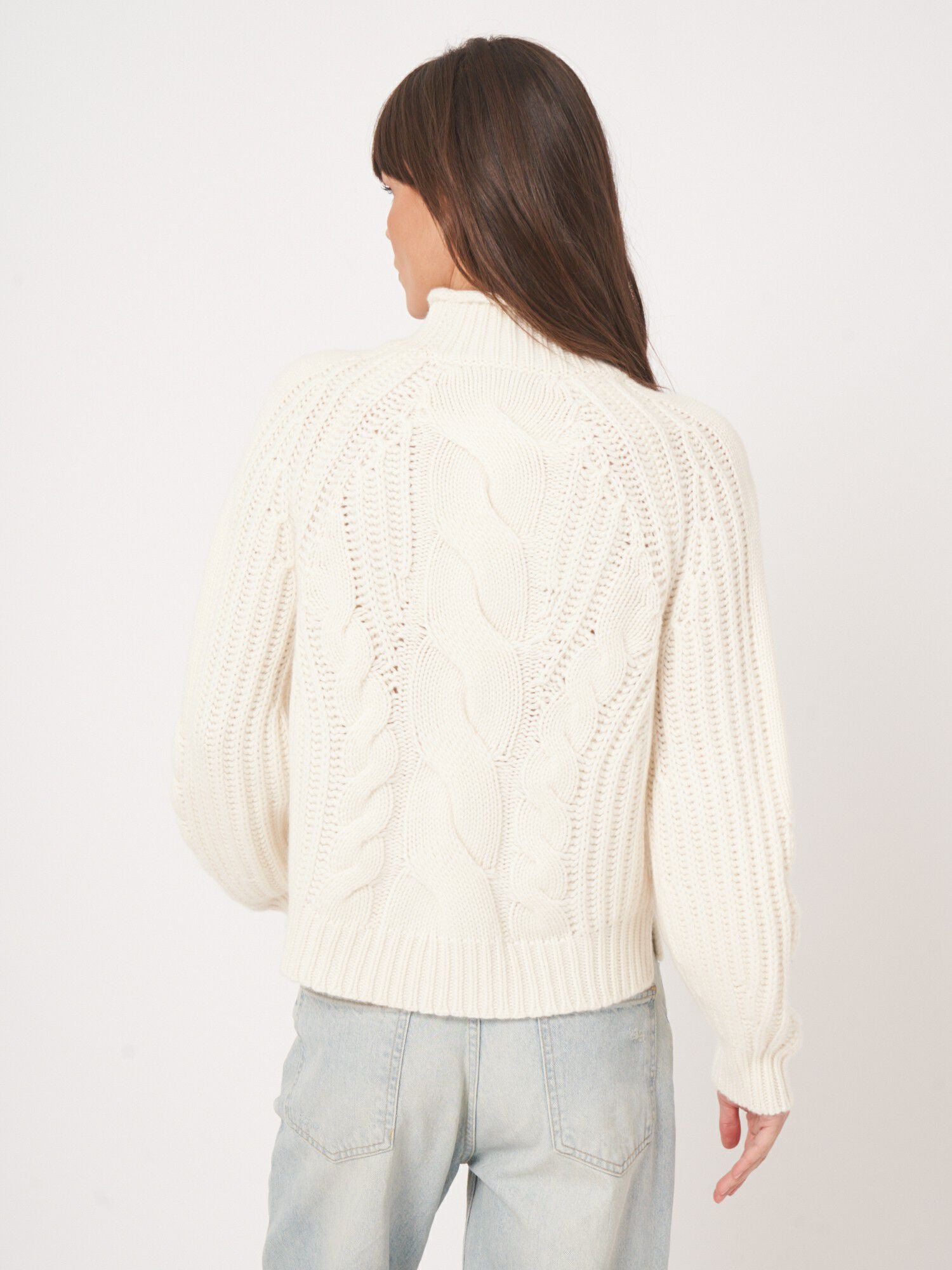 One-of-a-kind forever sweater! Medium-weight chunky knit with cable pattern, organic cashmere GOTS certified. Stand collar, long raglan sleeves with ribbed cuff, ribbed hem. Casual style, regular fit, cable knit with mixed textures.