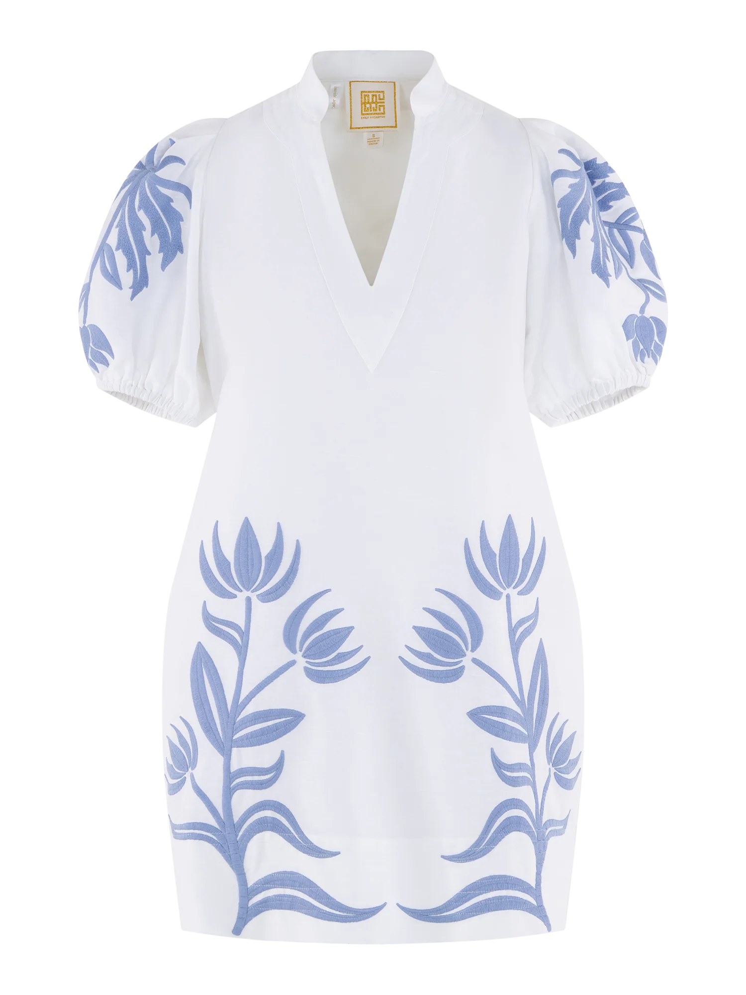 The Hampton Mini in Dutch Tile from Emily McCarthy is a fresh take on an enduring silhouette. Designed with a mandarin-style collar, softly puffed sleeves with elastic cuffs, and a subtly tailored shape, it’s finished with functional side pockets for everyday ease. Delicate embroidered florals bloom along the front and sleeves, adding texture and a touch of whimsy to this elevated spring classic.