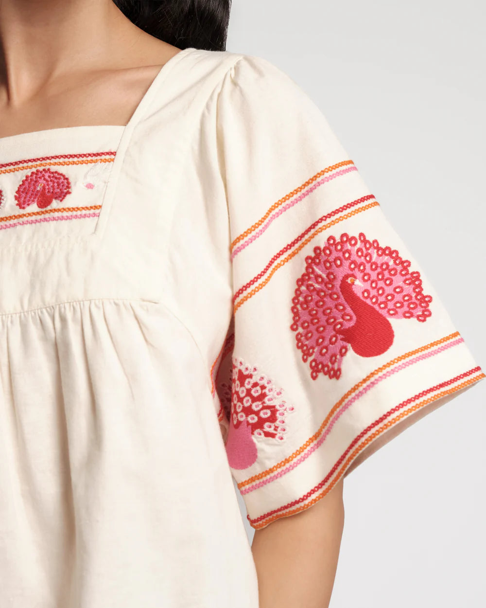 Introducing our new Picnic top from Frances Valentine, designed to step up your everyday looks with a detailed and dimensional short sleeve. Style the embroidered top with your favorite bottoms, and let its peacocks do the talking.