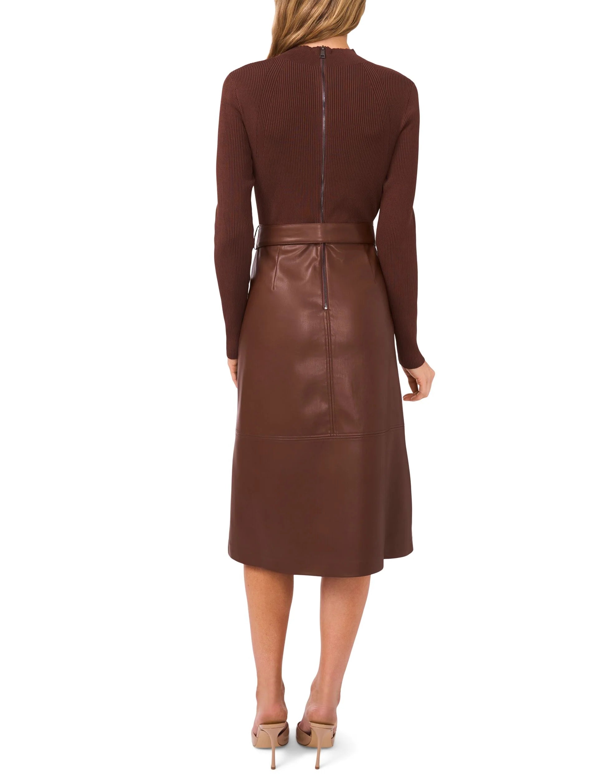 Bold meets elegance in this beautiful dress by Ted Baker. The sleek mock neckline offers a modern, sophisticated touch, while the faux leather skirt adds an edge of daring allure. Top: 60% Polyester, 40% Viscose, Bottom: Polyurethane Face, 100% Polyester Base